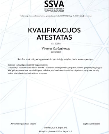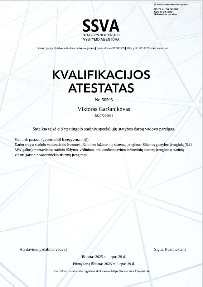 Šis kvalifikacijos atestatas patvirtina, kad įmonės specialistas gali dirbti su ypatingais pastatais ir turi reikiamą kompetenciją atlikti sudėtingus inžinerinius darbus. Tai garantuoja, kad visi darbai, susiję su šildymo, vėdinimo, vandentiekio ir kitomis sistemomis, bus atliekami profesionaliai ir saugiai.